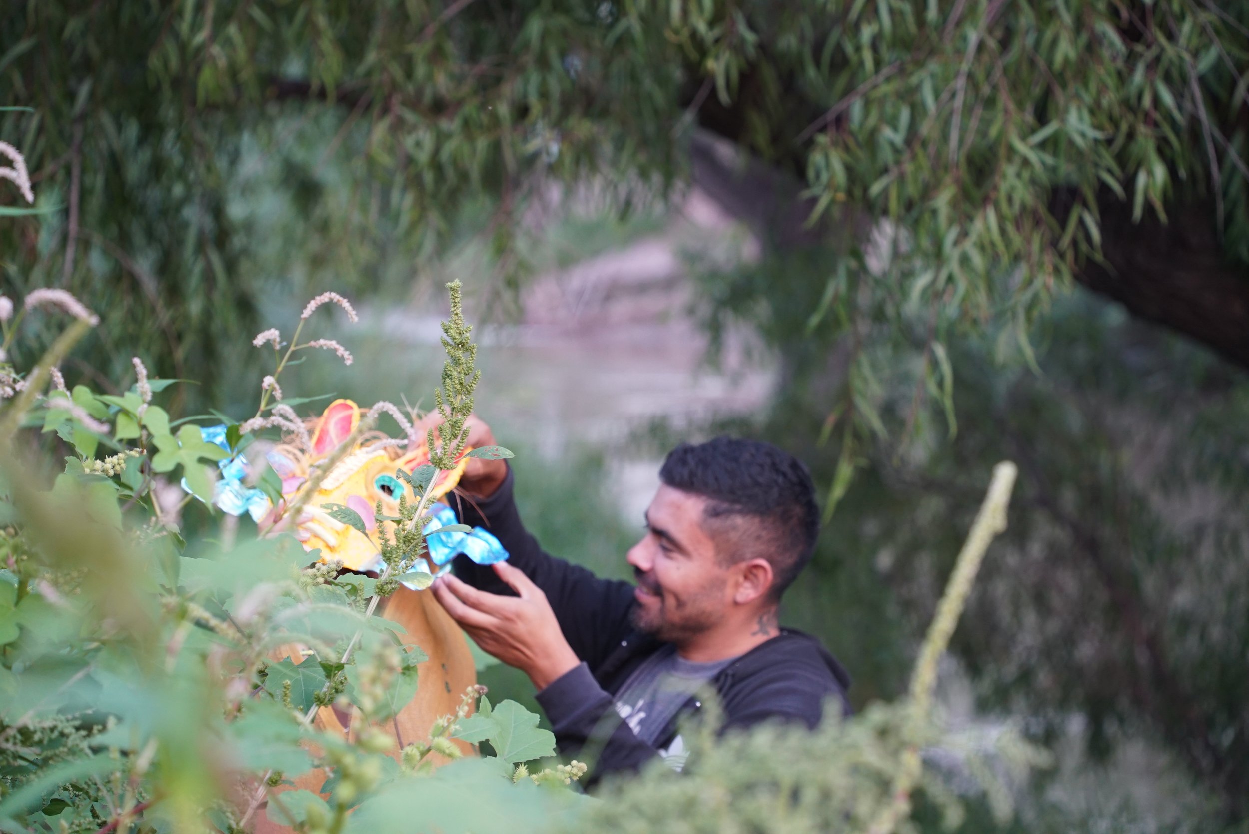 Directed by artist Hongbo Cai and mask artisan Diego Tzinacan, participants designed and crafted their own masks in a series of workshops, and it is with these same community members that the film and live mask theater were conceived and performed. Through four “missed encounters” between two half-human, half-animal figures, the project explores the region’s urgent water issues—drought, contamination, and habitat loss—linking ecological imbalance to emotional distance. The live performance integrates the indigenous snake flute, whose haunting timbre connects ritual, nature, and collective memory. The program is set up to foster cross-cultural exchange between Mexico and the United States.